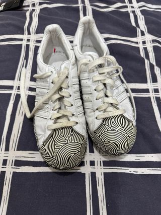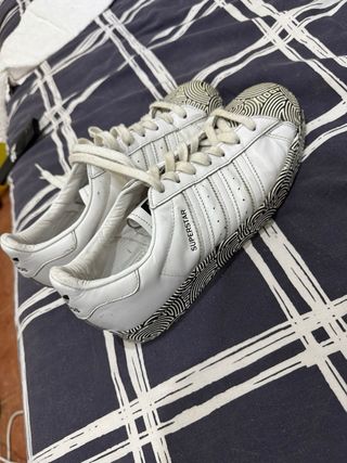 Zapatillas Adidas Superstar con un diseño único y llamativo. - Parte superior de cuero blanco. - Detalles gráficos en la puntera. - Cordones blancos.