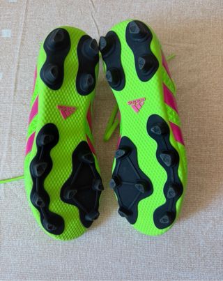 Zapatillas de fútbol Adidas en llamativo color verde con detalles en rosa. - Diseño deportivo. - Talla 40.5.