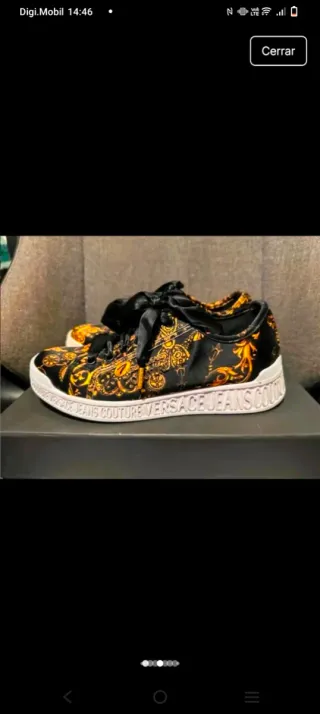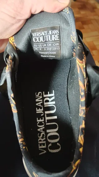Deportivas Versace Jeans Couture originales en su caja. Color negros con estampado de la marca en tonos amarillos. Cordones de estilo lazo de raso negro. Talla 36. Precio en tienda 206,90€ - Diseño con cordones. - Lazos de satén negros. - Suela blanca.