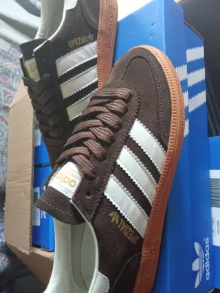 Zapatillas Adidas Spezial en ante marrón con detalles blancos. - Diseño clásico de tres rayas. - Suela de goma. - Detalle de Spezial en dorado.
