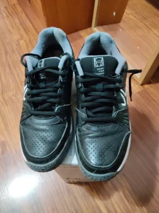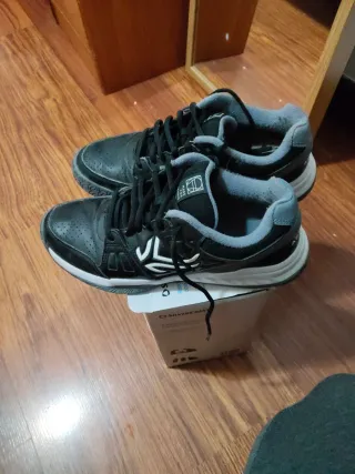 Zapatillas deportivas Decathlon para tenis. - Diseño en color negro con detalles blancos. - Cierre de cordones. - Suela de goma.