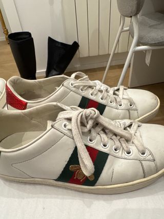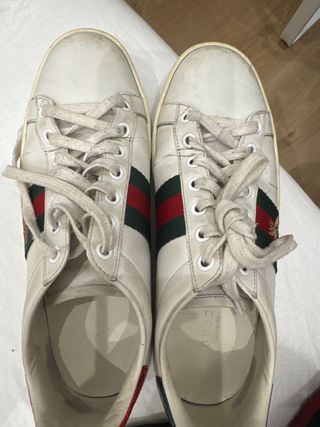 Zapatillas de la marca Gucci en color blanco con detalles multicolor. - Diseño clásico con las icónicas rayas verdes y rojas. - Logo de la marca en la suela interior. - Cierre con cordones.