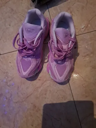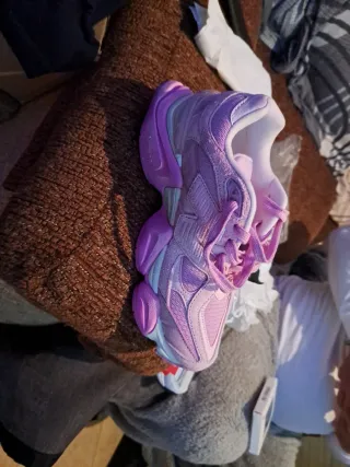 Par de tenis con un diseño moderno y llamativo. - Combinación de colores rosa y morado. - Cordones para un ajuste seguro. - Suela gruesa para mayor comodidad.