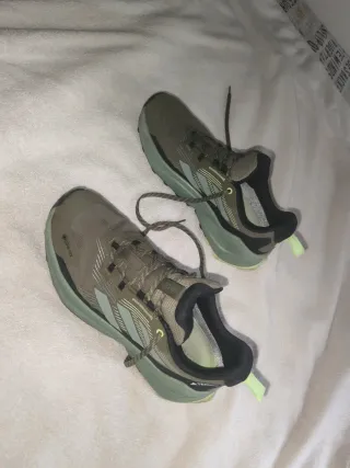 Zapatillas deportivas Adidas Terrex en color verde oliva, ideales para senderismo y actividades al aire libre. - Tecnología Gore-Tex para impermeabilidad. - Suela con buen agarre. - Diseño deportivo y moderno.