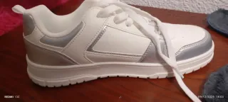 Tenis deportivos blancos con detalles en azul, talla 37. Perfectos para el día a día. - Diseño moderno y ligero. - Material textil transpirable. - Suela cómoda y flexible.