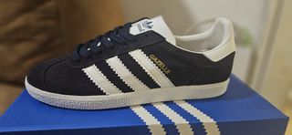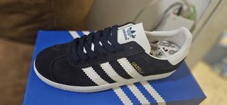 Zapatillas deportivas Adidas Gazelle en color azul marino y blanco. Un clásico atemporal. - Diseño icónico de tres rayas. - Detalle Gazelle en dorado. - Logo de Adidas en la lengüeta y el talón.