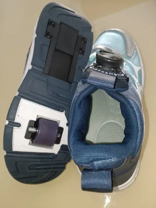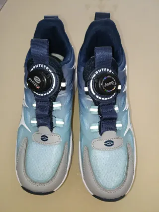 Zapatillas deportivas con un diseño moderno y llamativo. - Cierre de disco para un ajuste rápido. - Combinación de tonos azules y grises. - Detalle de líneas reflectantes.