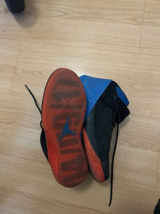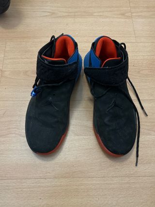 Zapatillas de baloncesto Jordan en color negro con detalles en rojo y azul. Tienen dos usos - Diseño de caña alta. - Cierre con velcro y cordones. - Suela de goma roja.
