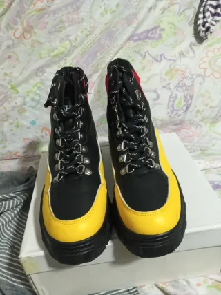 Botas estilo tenis con un diseño moderno y llamativo. - Combinación de colores negro y amarillo. - Cordones blancos y negros. - Ojales metálicos para los cordones. - Suela gruesa y robusta.