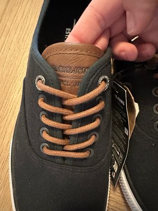 Zapatillas casuales con un diseño moderno y versátil de la marca Jack&Jones. - Exterior de tela resistente. - Cordones de color marrón. - Detalle en el talón. - Suela blanca con textura. Están nuevos sin estrenar, con etiqueta. Hago envíos por correos.