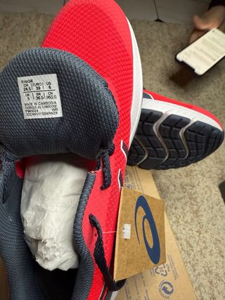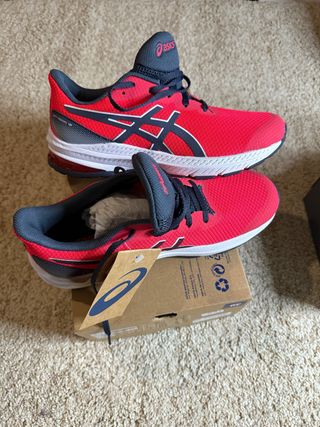 Zapatillas deportivas Asics en talla 39. Combinan un vibrante color rojo con detalles en azul marino y blanco. - Diseño deportivo. - Cierre de cordones.