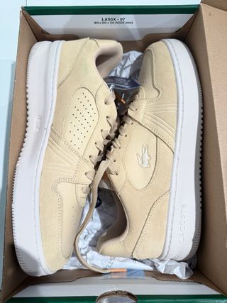 Auténticos tenis Lacoste en talla 41, se entregan con su caja original. - Diseño moderno en tonos beige y blanco. - Detalles de la marca visibles.