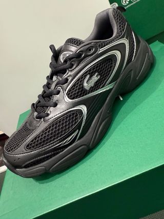 Zapatillas deportivas Lacoste en color negro y plateado. Diseño moderno y cómodo. - Logo de cocodrilo plateado. - Paneles de malla transpirable. - Detalles plateados en los laterales.