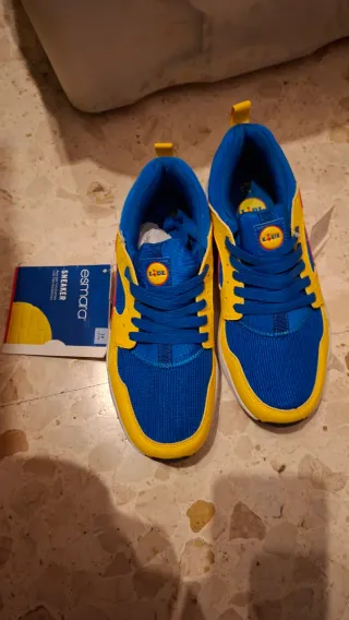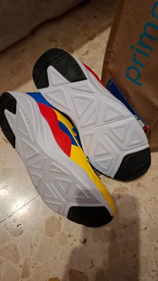 Zapatillas deportivas con un diseño llamativo y colores vibrantes. - Talla 38. - Combinación de azul, rojo y amarillo. - Suela blanca con detalles en negro.