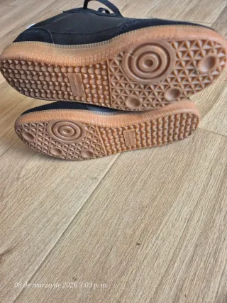 Zapatillas Adidas Samba clásicas en color negro y blanco. - Diseño icónico con las tres rayas. - Detalle de la marca en la lengüeta. - Suela de goma. - Nombre 'SAMBA' en el lateral. Comprado de hucco
