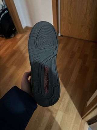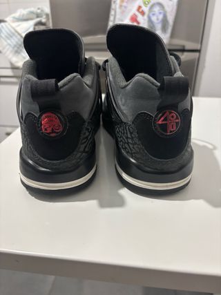 Par de tenis Jordan en tonos negro y gris. - Diseño con detalles texturizados. - Logos distintivos en los talones.