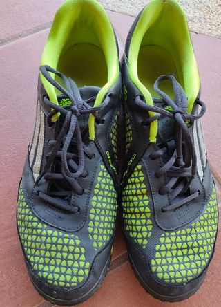 Zapatillas de fútbol Adidas en color negro y verde. Talla 46. - Diseño deportivo. - Cierre con cordones. - Detalle de tres rayas laterales.