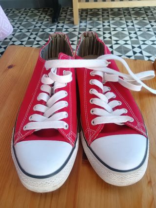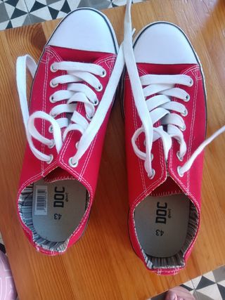 Zapatillas deportivas DOC, rojas, talla 43. Están prácticamente nuevas, usadas solo una vez. Son de lona y tienen un diseño clásico. Son de la marca de Hipercor. - Lona resistente. - Cordones blancos.