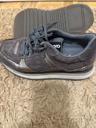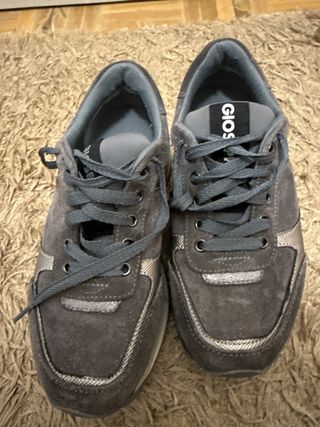 Zapatillas deportivas de la marca GIOS. - Diseño moderno en tonos grises y plateados. - Cierre con cordones para un ajuste seguro. - Detalle de banda plateada en los laterales.