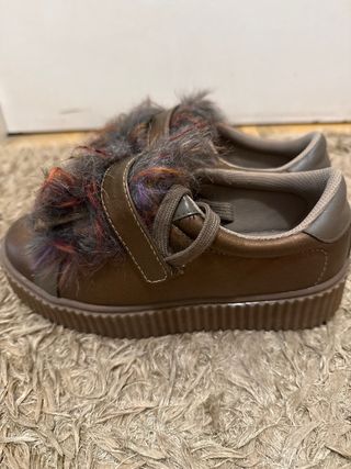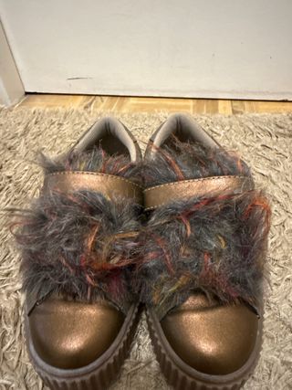 Estos tenis combinan un diseño moderno con detalles llamativos. - Acabado metálico en tono dorado. - Adorno frontal de peluche con hilos multicolor.