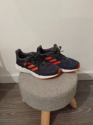Zapatillas deportivas Adidas en talla 34. Combinan un diseño moderno con detalles en naranja y azul. Desgaste normal en la suela. Se aprecia en la última foto - Cierre con cordones. - Suela de goma. - Logo de Adidas en la lengüeta y el lateral.