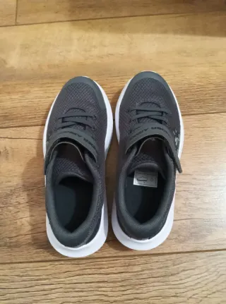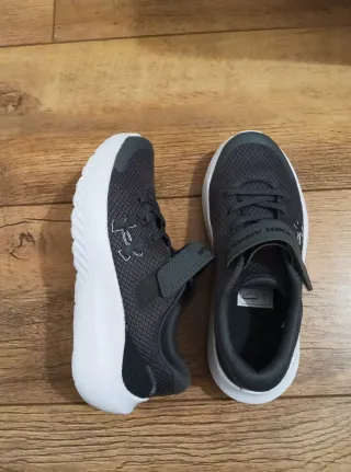 Zapatillas deportivas Under Armour para niñ@s, talla 31. - Modelo UA BPS Surge 4 AC. - Color gris con detalles en blanco y negro. - Cierre de velcro y cordones. - Suela blanca.