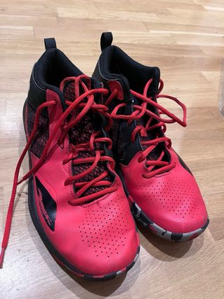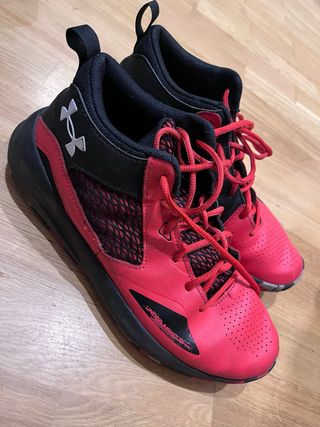 Zapatillas de baloncesto de caña alta con un diseño moderno y deportivo. - Combinación de colores rojo y negro. - Cierre con cordones para un ajuste seguro. - Detalle de malla transpirable en los laterales. - Logo de Under Armour visible.