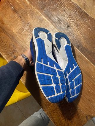 Zapatillas de running con un diseño moderno y deportivo. - Combinación de colores azul y blanco. - Logo de la marca visible en el lateral.