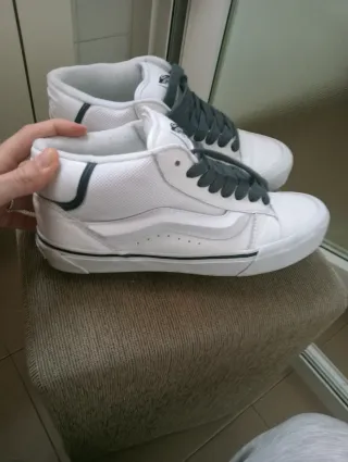 Zapatillas de la marca Vans en talla 40. Combinan un diseño clásico con detalles modernos. - Exterior de ante y lona. - Raya lateral característica de Vans. - Cordones blancos. - Suela de goma vulcanizada.
