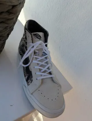 Zapatillas altas de la marca Vans con un diseño multicolor en tonos claros. Manchas por lluvia en la parte delantera y trasera. Quitando esto, muy pocos usos, suela como nueva sin signos de desgaste.