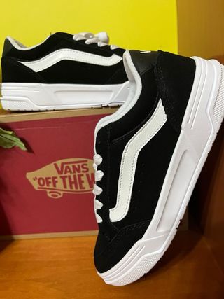 Zapatillas de la marca Vans modelo Hylane, en cuero en color negro con detalles blancos. - Diseño clásico de la marca. - Cordones blancos. - Suela blanca.