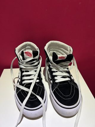 Zapatillas altas Vans Sk8-Hi en color negro. Un clásico de la marca con un diseño icónico. En perfecto estado por sí escaso uso. - Cierre de cordones. - Suela de goma vulcanizada. - Banda lateral característica.