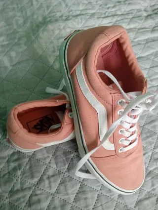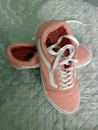 Zapatillas de la marca Vans en color rosa con detalles blancos. Perfectas para el día a día. - Diseño clásico de Vans. - Cordones blancos. - Suela de goma blanca. - Dos pares, uno talla 37 y otro talla 38. - Cada uno 50€, los dos 95€.