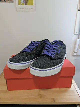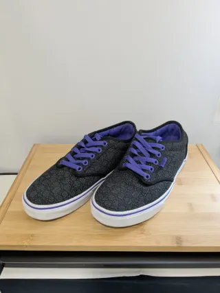 Vans gris oscuro estampadas vintage con cordones, suela e interior de color morado. En perfecto estado solo se usaron una vez. No conservo la caja original