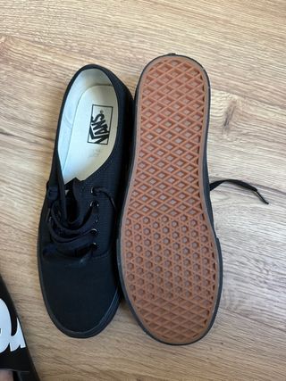 Vans Talla 42 Negra-blanca, suela marrón Nuevas, utilizadas una vez (me hacen daño) Uno de los cordones está deshilachado - Suela de goma en tono marrón Entrega en Santander o en Bilbao centro (también hago envíos)
