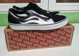 Zapatillas Vans Old Skool con un diseño de llamas en colores vibrantes. Prácticamente nuevas, casi no se han usado, se puede apreciar en las suelas y en la zapatilla en sí, las vendo por falta de uso. - Parte superior de ante y lona. - Banda lateral característica de Vans. - Suela de goma vulcanizada. - Cierre de cordones.