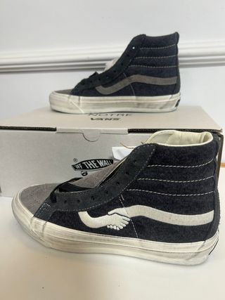 Vans Sk8-Hi LX Reissue 38 Nobuk Negro LX NOTRE Raven Zapatillas altas de nobuk. Perforaciones delante. Banda en contraste en los laterales con detalle de manos (edición especial). Unisex Negras con detalle gris en puntera. Doble juego de cordones. Color: negro y blanco. Exterior: piel nobuk y tela. Suela: elastómero. Modelo **LX (Notre/Raven)con acabados premium y materiales de mayor calidad que la línea estándar. Colaboración especial con NOTRE y color Raven 🐦⬛ Cuello acolchado para mayor comodidad y sujeción del tobillo. Suela tipo waffle clásica de Vans para mejor agarre. Talla: 40,5 Estado: Nuevas con caja.