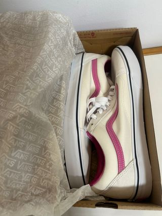 Zapatillas Vans Old Skool con un diseño clásico y llamativo. Zapatillas Vans Old Skool originales en talla 46. Color crudo (blanco roto) con banda lateral e interior en rosa. Fabricadas en piel y nobuk, con suela de caucho blanca y detalle del logo en la parte trasera. Cierre con cordones. Están nuevas a estrenar y con caja. Modelo clásico, muy combinable - Combinación de colores crudo y rosa fucsia. - Estilo Old Skool icónico.