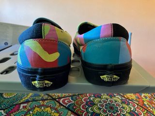 Zapatillas Vans con un diseño vibrante y juvenil. - Solo se han usado una vez. - Combinación de colores azul, amarillo y verde. - Detalle de la icónica franja lateral de Vans.