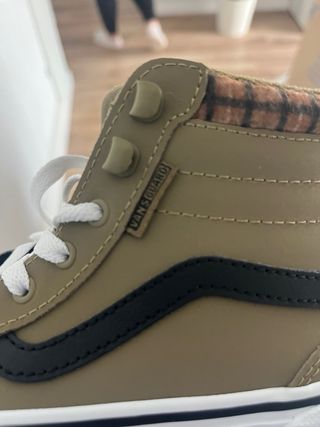 Zapatillas altas Vans Sk8-Hi para niños en talla 33. Un diseño clásico con un toque moderno. - Color verde militar. - Detalle de cuadros en el cuello. - Cierre con cordones blancos. - Suela de goma blanca.nuevos en su caja.