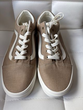 Zapatillas de la marca Vans en un bonito color beige con detalles blancos. - Diseño clásico de Vans. - Cordones blancos. - Suela de goma blanca.