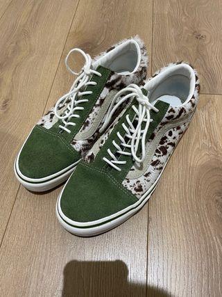 Zapatillas Vans Old Skool con un diseño único. - Combinación de ante verde y pelo estampado. - Cordones blancos. - Suela blanca con ribete verde.
