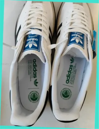 Zapatillas Adidas Samba OG con un diseño clásico y moderno. Son un modelo vegano, ideal para quienes buscan estilo y sostenibilidad. - Color blanco con detalles en negro. - Talla EU 41. - Logo de Adidas en la lengüeta y plantilla. - Símbolo vegano en la plantilla.