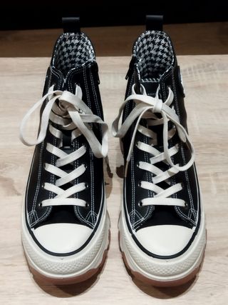 Zapatillas deportivas de mujer con cordones y cremallera lateral. Suela gruesa. Caña por encima del tobillo. Talla 41, dan poca talla. (Yo uso un 40 y me quedan bien). Marca: Chika10 Material: piel vegana. Están nuevas, solo usadas un rato en casa para probar. Se me pasó el plazo de devolución, por eso las vendo.