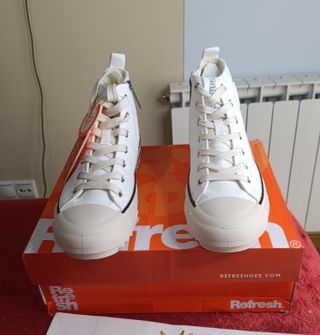 Zapatillas de la marca Flamingos Life, talla 37. Un calzado vegano con un diseño moderno. - Exterior de cuero sintético y ante. - Suela de goma. - Cordones blancos y negros. - Detalle de logo en el lateral. Totalmente nuevas, se venden con la caja original y la etiqueta. Han sido un regalo que no he podido aprovechar porque me iban muy pequeñas y ya no se podían devolver. Modelo descatalogado y con un precio de reventa de 210-230€ en webs como StockX o Tone.