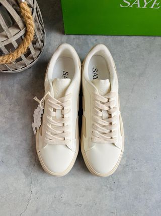 Zapatillas veganas de la marca Saye en talla 38. Un calzado cómodo y con un diseño moderno. - Materiales veganos. - Color beige y blanco. - Logo de la marca en la plantilla y lateral.