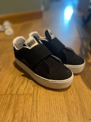 Vendo un par de zapatillas Goats, de color negro. Son de lona y tienen una plataforma blanca. Ideales para un look casual y cómodo. - Cierre con velcro. - Suela blanca. - 100% vegano
