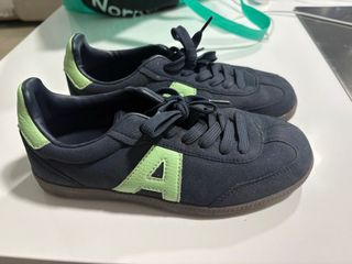 Zapatillas deportivas de la marca Álvaro Moreno con un diseño moderno. - Combinación de colores azul marino y verde lima. - Detalle de la letra A en el lateral.