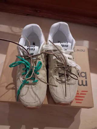 Zapatillas deportivas de la colaboración entre New Balance y Miu Miu. - Color beige con detalles verdes. - Cordones de dos colores: verde y marrón.