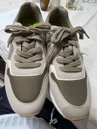 Zapatillas deportivas de estilo casual. - Combinación de colores verde y gris. - Detalle en naranja en el interior. - algo usabas pero están bien - perfectas para el día a dia